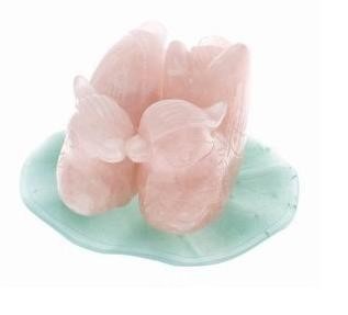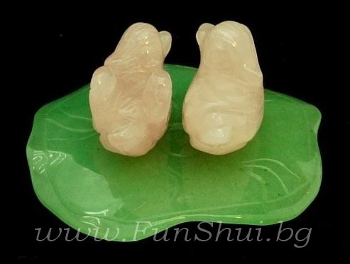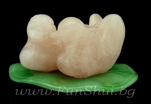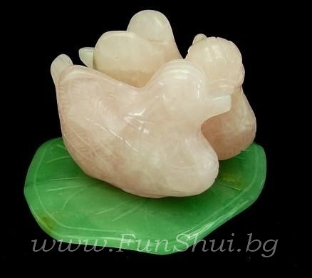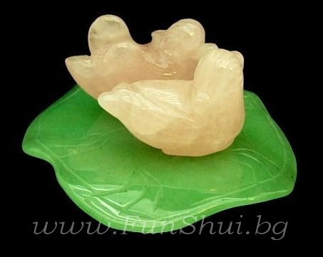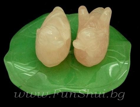 Фън Шуй Патици Мандаринки от Розов кварц върху Нефритено Листо от Лотос
