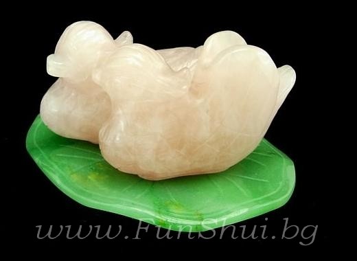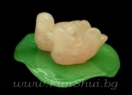 Мандариновите патици лежат върху Листо от Лотос изработено от Нефрит. Китайците считат нефрита за прародител на всички камъни и го наричат “Камък на Боговете”. Ако търсите щастие, духовен мир и телесно здраве – това е вашият талисман!